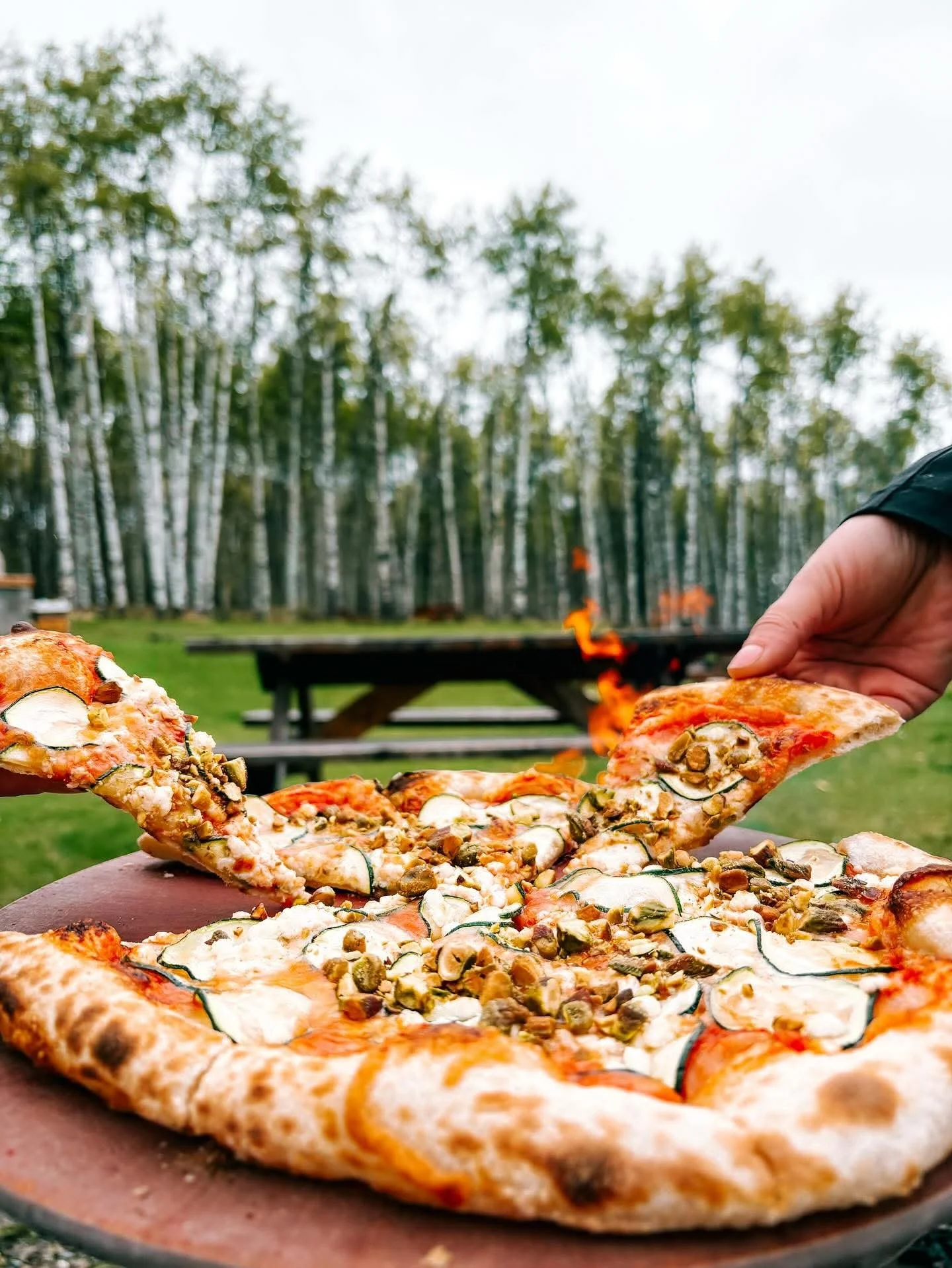 Fresh zucchini, with goat cheese and mozzarella, tomato sauce, on a sourdough crust, finished with chopped pistachios