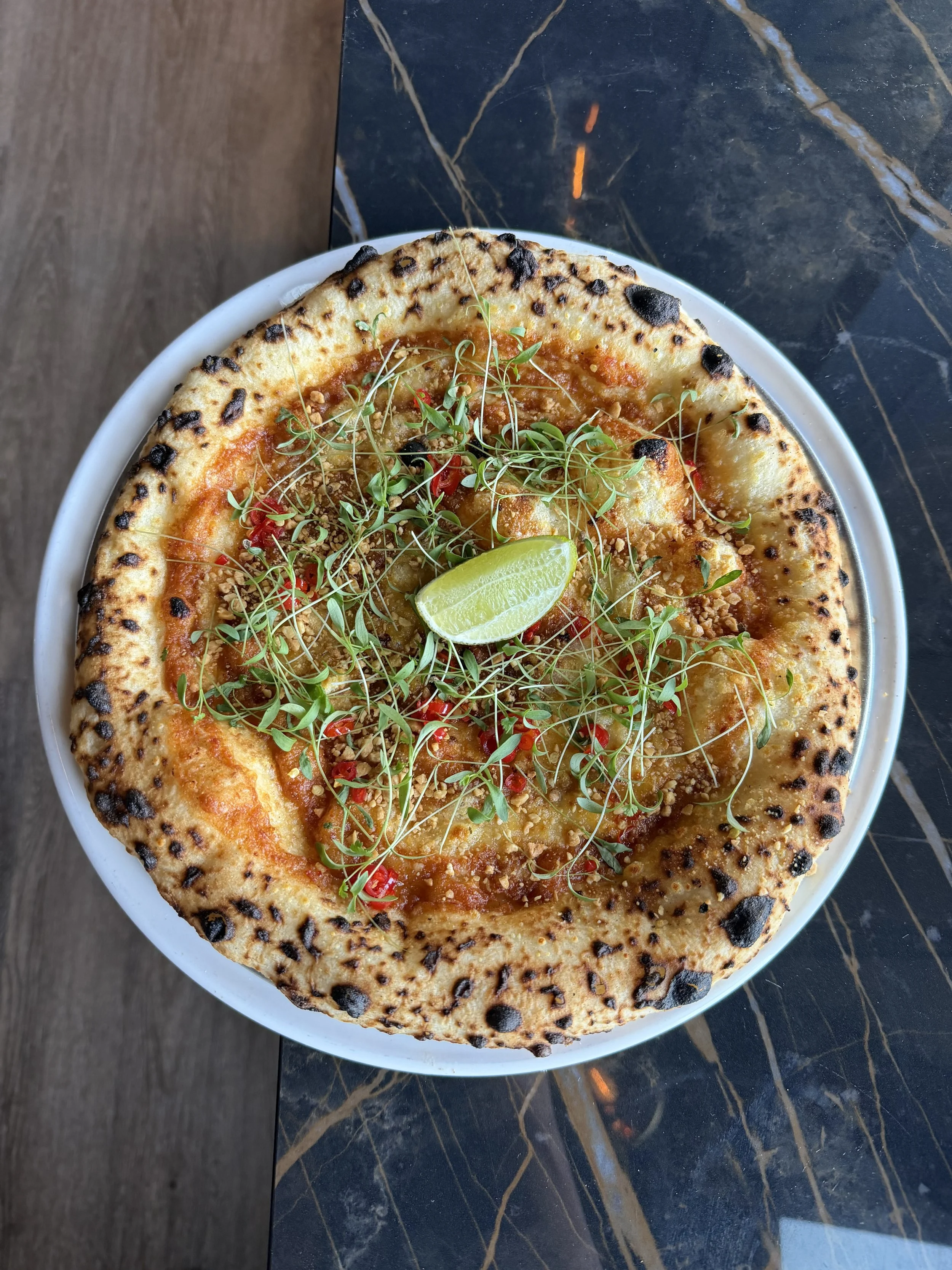 This spicy and savoury pizza has a peanut satay base, satay marinated chicken, parmesan cheese, candied birds eye chilis, and is garnished with cilantro and crushed peanuts! We are always exploring international flavours and trying out different flavour combinations at Letty. This pizza will be perfect with a glass of Kepen Riesling!