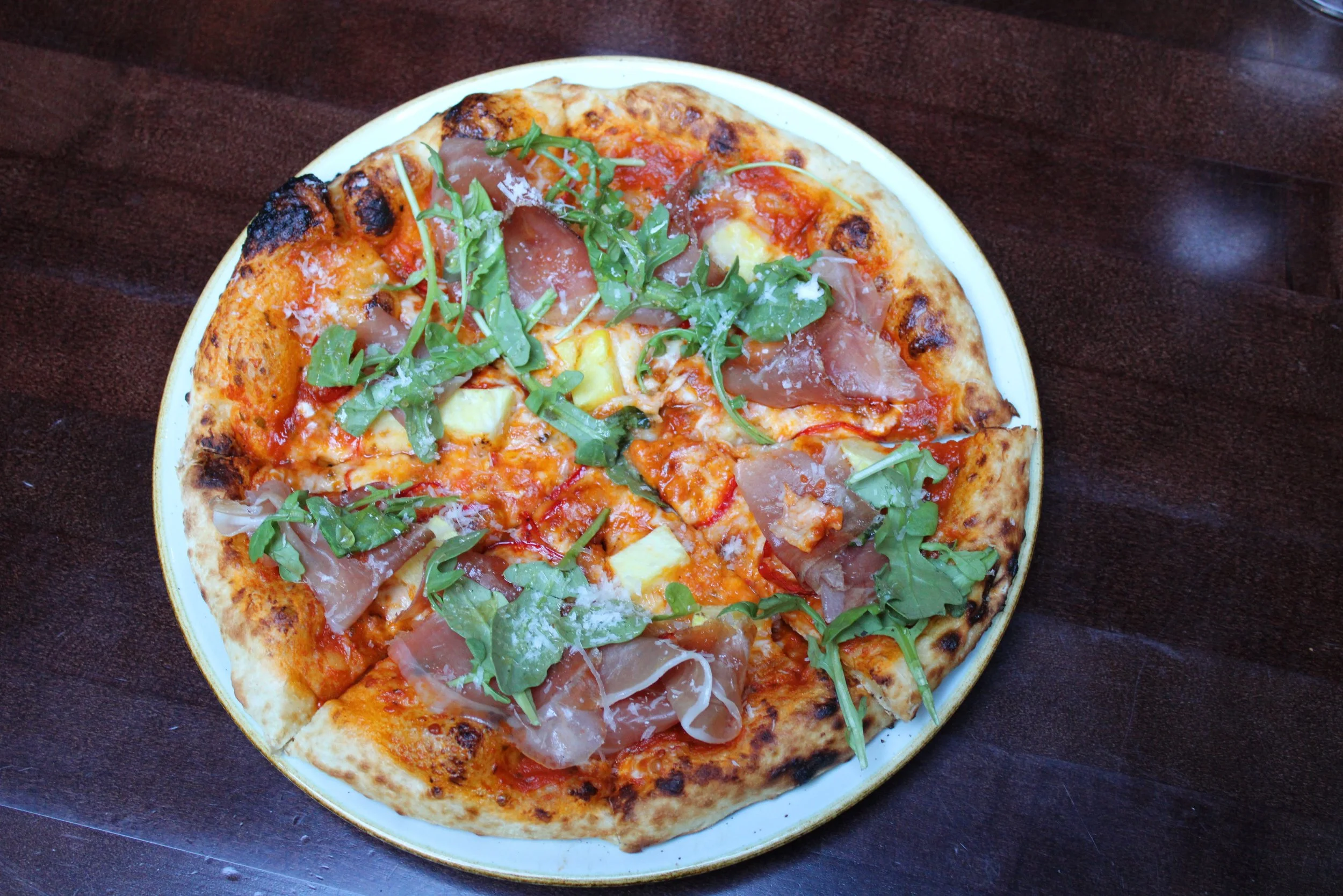 Tomato sauce, mozzarella, speck, pineapple, arugula, pickled fresno, smoked honey