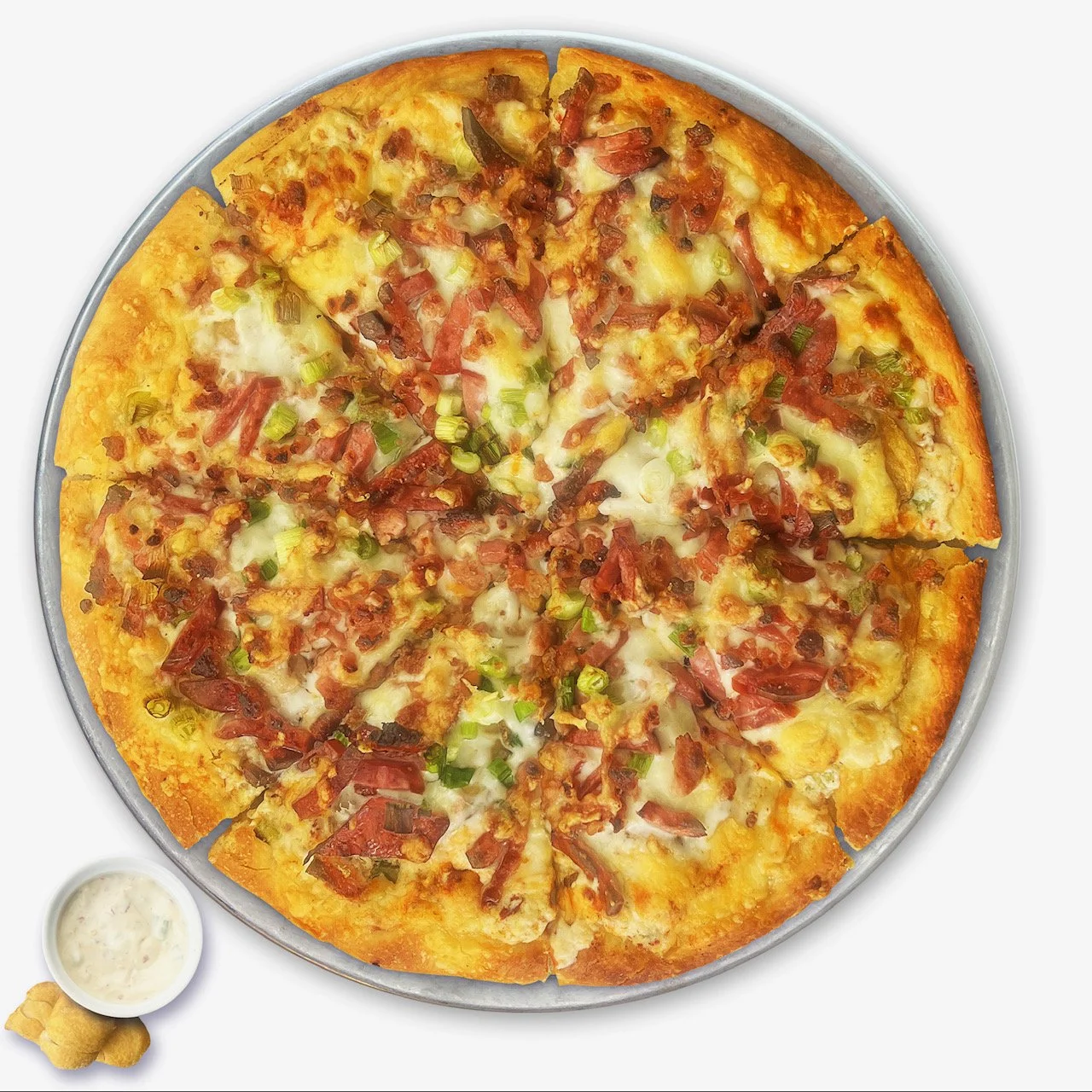The Perogy Pizza Pie is our delicious tribute to this classic Ukrainian favourite! It starts with a layer of our house-made Perogy inspired secret sauce as the base. Next comes the tender sliced potatoes, smoky bits of crispy bacon, and a perfect mixture of bubbling cheddar and mozza cheeses. Fresh green onions add the bite, and hearty slices of Ukrainian garlic sausage seal the deal. It's creamy, savory, cheesy, and unapologetically loaded - like your favorite perogies crashed a pizza party!